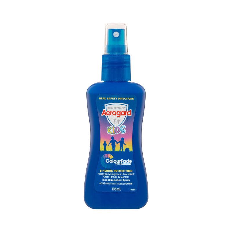 Aerogard Kids Insect Repellent Spray uses ColourFade Technology and repels mosquitoes, flies, sandflies and other annoying and biting insects for up to 6 hours