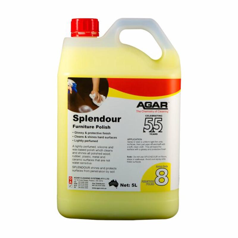 Agar Splendour Furniture Polish 5L is a silicone and wax-based spray polish that cleans, shines, and protects in one easy application. Ideal for use on vinyl, plastic, metal, water-resistant polished wood, and ceramic surfaces, it removes dust and fingerprints while leaving a protective, glossy finish. Lightly perfumed and easy to apply, Splendour is perfect for office furniture, counters, tables, filing cabinets, and more. Not suitable for French polished timber surfaces.