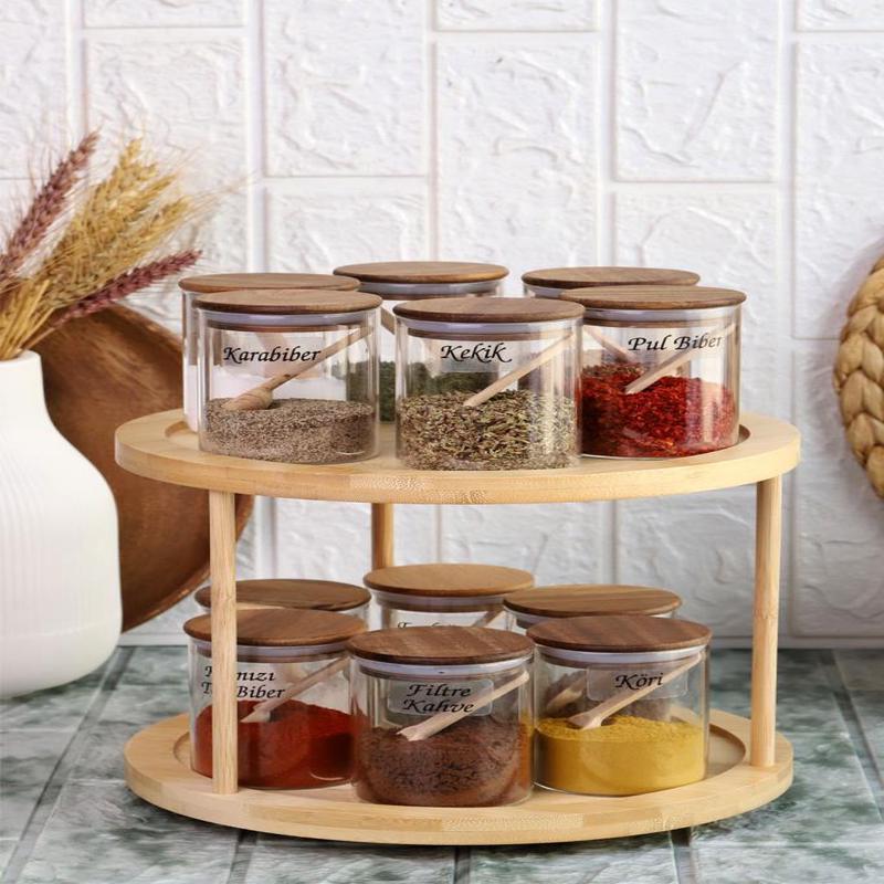 Borosilicate Glass Spice Shaker Set with Acacia Silicone Lid and Rotating Stand 250 ml (37 Pieces) This special set, poised to be a favorite for those seeking elegance, hygiene, and practicality in the kitchen, stands out with its natural bamboo texture and functional design. Offering both a tidy appearance and healthy storage, this set exudes quality in every detail. Product Dimensions: Spice shaker: 6.5 x 9 cm Rotating Stand: 24.5 x 21 cm Material Information: Lids are Acacia, spoons: 100% natural Bamboo Spice shaker body: Heat-resistant borosilicate glass Washing Instructions: Borosilicate glass jars can be washed in the dishwasher It is recommended to wash bamboo parts by hand Set Content (Total 37 Pieces): 12 pieces of borosilicate glass spice shaker (250 ml) 12 pieces of bamboo spice spoons 12 pieces of silicone leak-proof lids 1 piece of 360 rotating bamboo stand 65 pieces of spice labels as a gift Product Features: Vacuum silicone lids prevent spices from spilling and provide ease of use Thanks to the transparent structure of the glass bottles, you can easily see the content and easily measure how much you need. The 250 ml capacity spice shakers allow you to keep your spices fresh and hygienic for a long time. With the rotating stand, you can reach all spices with a single move and use them in the kitchen. You save time and space. Thanks to its natural bamboo material, it offers both aesthetic and environmentally friendly use. Additional Information: Each bamboo and Acacia piece is natural, therefore color and pattern may vary – each product is unique. Product images belong to us and fully reflect the set contents.