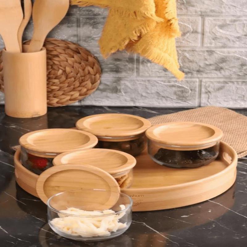 Thanks to its special flat lid structure, you can easily stack your breakfast items in the refrigerator. You can also use the breakfast items as a storage container. You can also use the Natural Bamboo tray as a serving tray for 4 people. The tray is 32x22cm natural bamboo, the storage containers are 6 pieces of 300ml borosilicate glass and measure 10x10x6cm. The lids are 6 pieces of natural bamboo with silicone seals and measure 10x10cm. It is recommended to hand wash the bamboo parts of our product. The glass containers are machine washable.