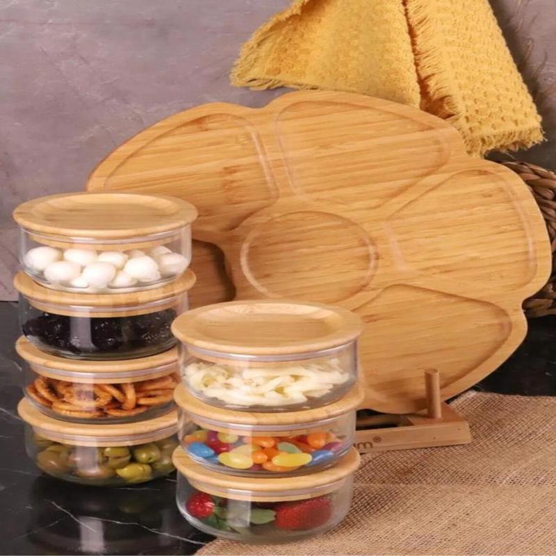 Duo – 7 Piece Rotating Tray Bamboo Silicone Lid Airtight Glass Breakfast Bowl 300 Ml
